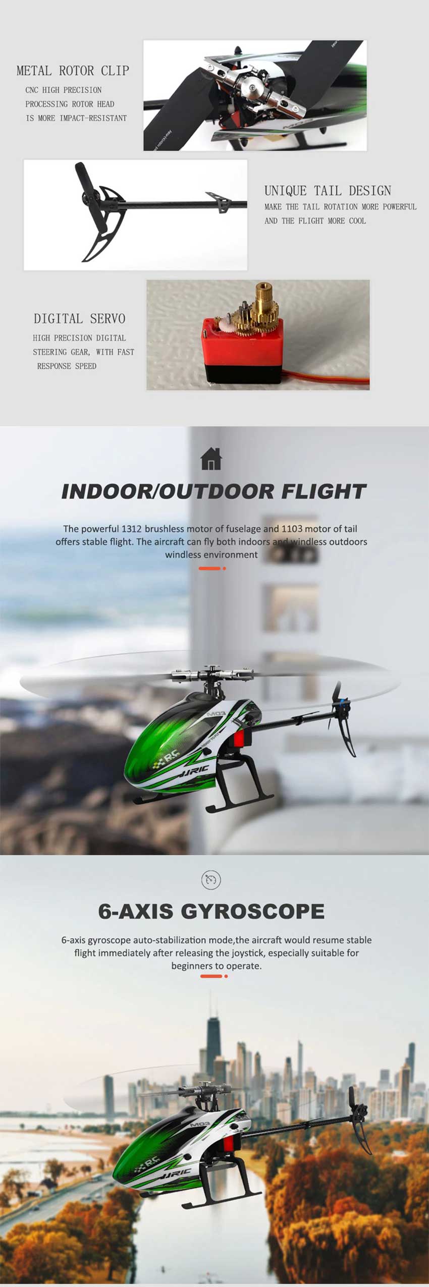 6. JJRC M03 Indoor/Outdoor Flying: The powerful 1312 brushless motor of the fuselage and 1103 motor of the tail with wear-resistant gear offers stable flight. The aircraft can fly both indoors and windless outdoors.